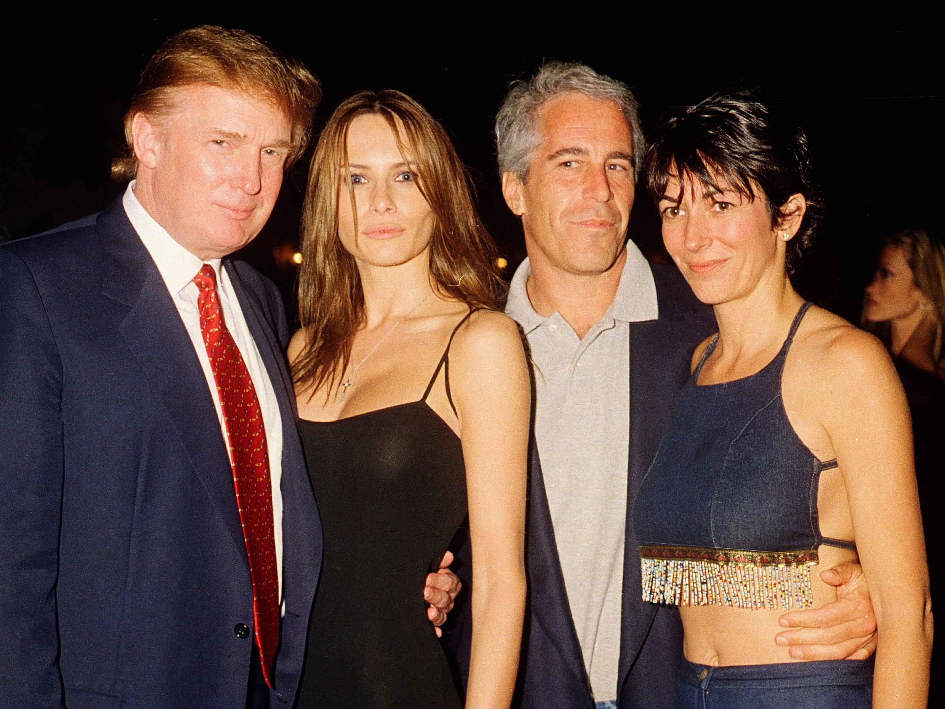 रियल एस्टेट डेवलपर डोनाल्ड ट्रम्प और उनकी प्रेमिका, मेलानिया नोज़, फाइनेंसर जेफरी एपस्टीन, और ब्रिटिश सोशलाइट घिसलीन मैक्सवेल 12 फरवरी, 2000 को फ्लोरिडा के पाम बीच के मार-ए-लागो क्लब में एक साथ पोज़ देते हुए।